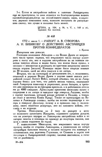 Рапорт А.В. Суворова А.И. Бибикову о действиях австрийцев против конфедератов. г. Краков. 1772 г. июля 1 // ЦГВИА, ф. 104, д. 86, ч. III, лл. 2 и 5, черновик без подписи.