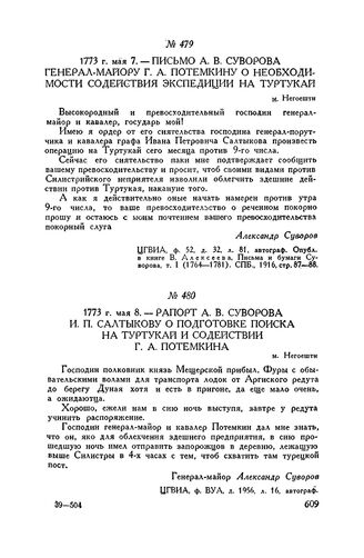 Рапорт А.В. Суворова И.П. Салтыкову о подготовке поиска на Туртукай и содействии Г.А. Потемкина. м. Негоешти. 1773 г. мая 8 // ЦГВИА, ф. ВУА, д. 1956, л. 16, автограф.