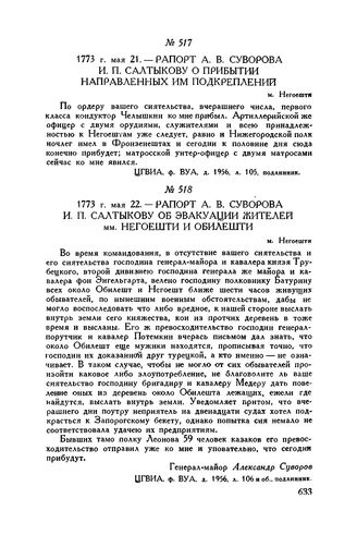 Рапорт А.В. Суворова И.П. Салтыкову об эвакуации жителей мм. Негоешти и Обилешти. м. Негоешти. 1773 г. мая 22 // ЦГВИА, ф. ВУА, д. 1956, л. 106 и об., подлинник.