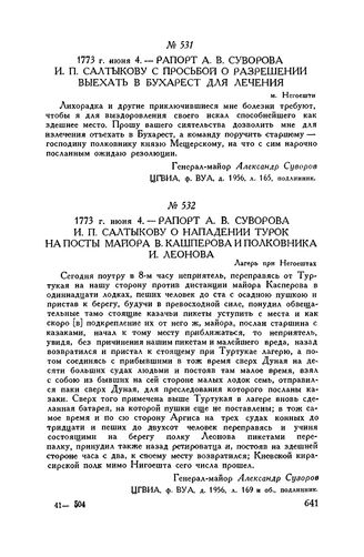 Рапорт А.В. Суворова И.П. Салтыкову о нападении турок на посты майора В. Кашперова и полковника И. Леонова. Лагерь при Негоештах. 1773 г. июня 4 // ЦГВИА, ф. ВУА, д. 1956, л. 169 и об., подлинник.