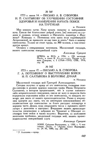 Письмо А.В. Суворова Г.А. Потемкину о выступлении войск И.П. Салтыкова в верховье Дуная. м. Негоешти. 1773 г. июня 17 // ЛОИИ, Собрание Воронцовых, д. 1309, л. 9, подлинник. Опубл. в «Архиве князя Воронцова», кн. 24. М., 1880, стр. 285-286.