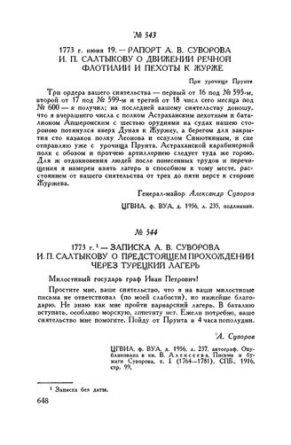 Записка А.В. Суворова И.П. Салтыкову о предстоящем прохождении через турецкий лагерь. 1773 г. // ЦГВИА, ф. ВУА, д. 1956, л. 237, автограф. Опубликована в кн. В. Алексеева, Письма и бумаги Суворова, т. I (1764—1781). СПБ., 1916, стр. 99.