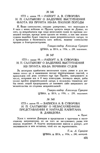 Записка А.В. Суворова И.П. Салтыкову о незаслуженном представлении к награде капитана В. Давыдова. м. Прунт. 1773 г. июня 19