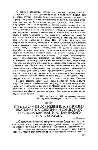 Из донесения П.А. Румянцева Екатерине II о движении и совместных действиях корпусов М.Ф. Каменского и А.В. Суворова. г. Фокшаны. 1774 г. мая 25