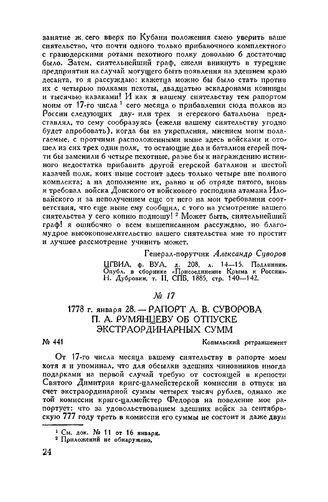 Рапорт А.В. Суворова П.А. Румянцеву об отпуске экстраординарных сумм. Копыльский ретраншемент. 1778 г. января 28 // Рукописный отдел Гос. библиотеки СССР им. В.И. Ленина, ф. Маркевича, № 5498 (5798). Подлинник.