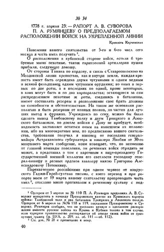Рапорт А.В. Суворова П.А. Румянцеву о предполагаемом расположении войск на укрепленной линии. Крепость Керченская. 1778 г. апреля 25