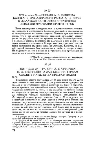 Письмо А.В. Суворова капитану бригадирского ранга А.И. Крузу о желательности демонстративных действий флотилии против турок. 1778 г. июня 22 // ЦГАВМФ, ф. Адмиралтейств-коллегия по канцелярии, д. 478, л. об. 194. Копия с копии, без подписи.