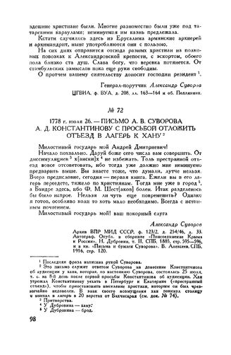Письмо А.В. Суворова А.Д. Константинову с просьбой отложить отъезд в лагерь к хану. 1778 г. июля 26 // Архив ВПР МИД СССР, ф. 123/2, д. 254/46, л. 33. Автограф. Опубл. в сборнике «Присоединение Крыма к России». Н. Дубровин, т. II, СПБ, 1885, стр. 595-596, и в кн. «Письма и бумаги Суворова». В. Алексеев, СПБ, 1916, стр. 120.