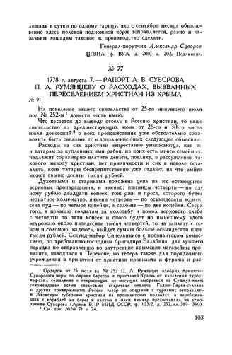 Рапорт А.В. Суворова П.А. Румянцеву о расходах, вызванных переселением христиан из Крыма. 1778 г. августа 7 // ЦГВИА, ф. ВУА, д. 208, лл. 203-204 и об. Подлинник. Опубл. в сборнике «Присоединение Крыма к России». Н. Дубровин, т. II, СПБ, 1885, стр. 634-637.