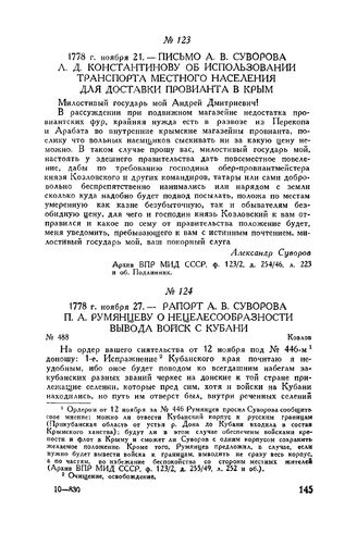 Рапорт А.В. Суворова П.А. Румянцеву о нецелесообразности вывода войск с Кубани. Козлов. 1778 г. ноября 27 // ЦГВИА, ф. ВУА, д. 208, л. 359-360. Подлинник.