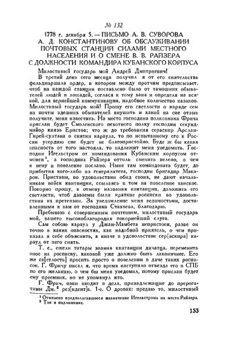 Письмо А.В. Суворова А.Д. Константинову об обслуживании почтовых станций силами местного населения и о смене В.В. Райзера с должности командира Кубанского корпуса. 1778 г. декабря 5 // Архив ВПР МИД СССР, ф. 123/2, д. 254/46, л. 280-281. Подлинник.