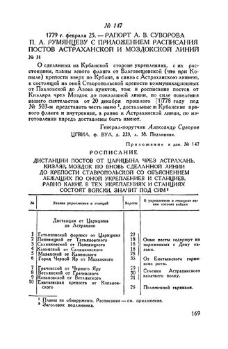 Рапорт А.В. Суворова П.А. Румянцеву с приложением расписания постов Астраханской и Моздокской линий. 1779 г. февраля 25 // ЦГВИА, ф. ВУА, д. 223, л. 38. Подлинник.
