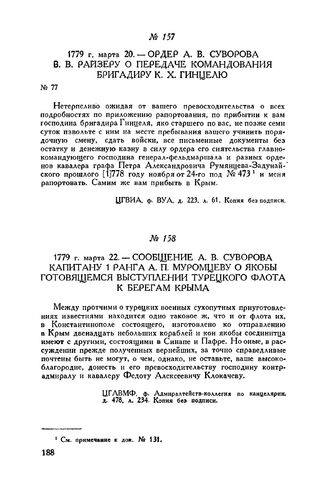 Ордер А.В. Суворова В.В. Райзеру о передаче командования бригадиру К.X. Гинцелю. 1779 г. марта 20