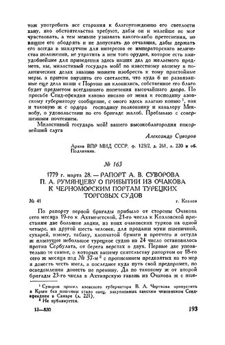 Рапорт А.В. Суворова П.А. Румянцеву о прибытии из Очакова к черноморским портам турецких торговых судов. г. Козлов. 1779 г. марта 28