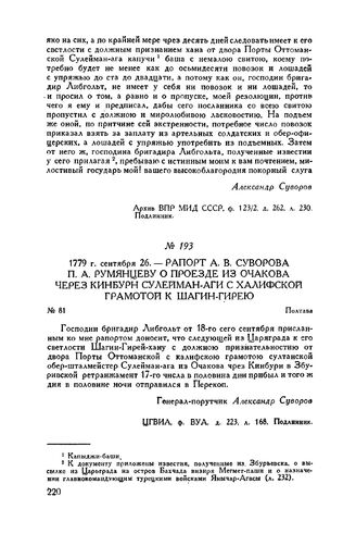 Рапорт А.В. Суворова П.А. Румянцеву о проезде из Очакова через Кинбурн Сулейман-аги с халифской грамотой к Шагин-Гирею. Полтава. 1779 г. сентября 26 // ЦГВИА, ф. ВУА, д. 223, л. 168. Подлинник.