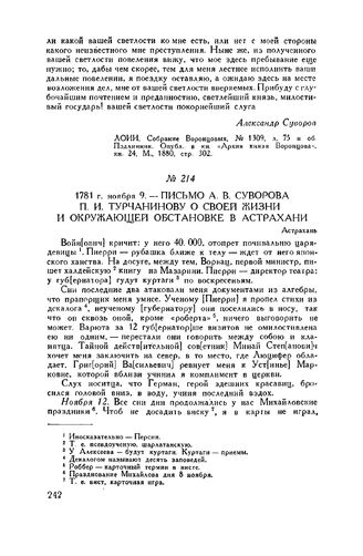 Письмо А.В. Суворова П.И. Турчанинову о своей жизни и окружающей обстановке в Астрахани. Астрахань. 1781 г. ноября 9 // «Суворовский сборник», т. XV, лл. 34-35 об. Автограф без подписи. Опубл. в кн. «Письма и бумаги Суворова». В. Алексеев, т. I, СПБ, 1916, стр. 203-209.