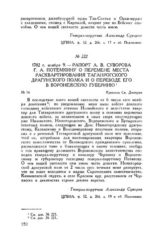 Рапорт А.В. Суворова Г.А. Потемкину о перемене места расквартирования Таганрогского драгунского полка и о переводе его в Воронежскую губернию. Крепость Св. Дмитрия. 1782 г. ноября 9 // ЦГВИА, ф. 52, д. 266, л. 19 и об. Подлинник.