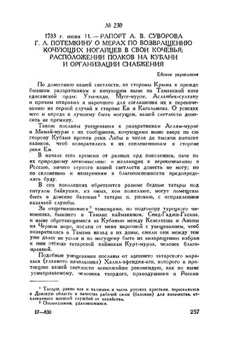 Рапорт А.В. Суворова Г.А. Потемкину о мерах по возвращению кочующих ногайцев в свои кочевья; расположении полков на Кубани и организации снабжения. Ейское укрепление. 1783 г. июня 11