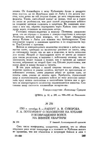 Рапорт А.В. Суворова Г.А. Потемкину о положении на Кубани и возвращении войск на зимние квартиры. У бывшей Александровской крепости. 1783 г. октября 8 // ЦГВИА, ф. 52, д. 289, л. 176 и об. Подлинник.