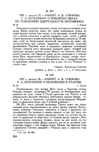 Рапорт А.В. Суворова Г.А. Потемкину о принятых мерах по усыплению бдительности противника. г. Херсон. 1787 г. августа 27 // ЦГВИА, ф. ВУА, д. 2415, ч. I, л. 19. Подлинник. Опубл. в сборнике военно-исторических материалов, вып. IV, «Письма и бумаги А.В. Суворова, Г.А. Потемкина и П.А. Румянцева. 1787-1789 г.» (Кинбурн-Очаковская операция). Д.Ф. Масловский, СПБ. 1893. стр. 1-179.