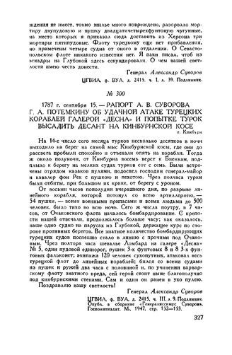 Рапорт А.В. Суворова Г.А. Потемкину об удачной атаке турецких кораблей галерой «Десна» и попытке турок высадить десант на Кинбурнской косе. г. Кннбурн. 1787 г. сентября 15 // ЦГВИА, ф. ВУА, д. 2415, ч. III, л. 9. Подлинник. Опубл. в сборнике «Генералиссимус Суворов», Госполитиздат, М., 1947, стр. 152-153. Опубл. в сборнике военно-исторических материалов, вып. IV, «Письма и бумаги А.В. Суворова, Г.А. Потемкина и П.А. Румянцева. 1787-1789 г.» (Кинбурн-Очаковская операция). Д.Ф. Масловский, СПБ. 1893. стр. 1-179.