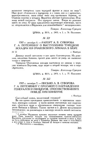 Письмо А.В. Суворова Г.А. Потемкину с просьбой о награждении генералов и офицеров, способствовавших победе при Кинбурне. г. Кинбурн. 1787 г. октября 7