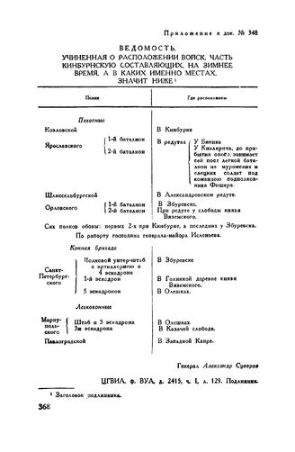 Приложение к рапорту А.В. Суворова Г.А. Потемкину. Ведомость, учиненная о расположении войск, часть кинбурнскую составляющих, на зимнее время, а в каких именно местах, значит ниже // ЦГВИА, ф. ВУА, д. 2415, ч. I, л. 129. Подлинник.