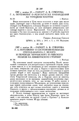 Рапорт А.В. Суворова Г.А. Потемкину о результатах наблюдения за турецким флотом. г. Кинбурн. 1787 г. ноября 23 // ЦГВИА, ф. ВУА, д. 2415, ч. I, л. 133. Подлинник. Опубл. в сборнике военно-исторических материалов, вып. IV, «Письма и бумаги А.В. Суворова, Г.А. Потемкина и П.А. Румянцева. 1787-1789 г.» (Кинбурн-Очаковская операция). Д.Ф. Масловский, СПБ. 1893. стр. 1-179.