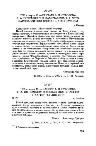 Письмо А.В. Суворова Г.А. Потемкину о намечаемом на лето расположении войск под Кинбурном. г. Кинбурн. 1788 г. марта 16 // ЦГВИА, ф. ВУА, д. 2415, ч. II, л. 108. Автограф. Опубл. в сборнике военно-исторических материалов, вып. IV, «Письма и бумаги А.В. Суворова, Г.А. Потемкина и П.А. Румянцева. 1787-1789 г.» (Кинбурн-Очаковская операция). Д.Ф. Масловский, СПБ. 1893. стр. 1-179.