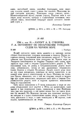 Рапорт А.В. Суворова Г.А. Потемкину об обнаружении турецких судов на Черном море. г. Кинбурн. 1788 г. мая 18 // ЦГВИА, ф. ВУА, д. 2415, ч. II, л. 191. Подлинник. Опубл. в сборнике военно-исторических материалов, вып. IV, «Письма и бумаги А.В. Суворова, Г.А. Потемкина и П.А. Румянцева. 1787-1789 г.» (Кинбурн-Очаковская операция). Д.Ф. Масловский, СПБ. 1893. стр. 1-179.