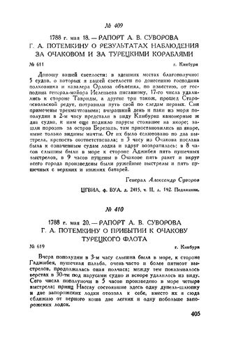 Рапорт А.В. Суворова Г.А. Потемкину о результатах наблюдения за Очаковом и за турецкими кораблями. г. Кинбурн. 1788 г. мая 18 // ЦГВИА, ф. ВУА, д. 2415, ч. II, л. 192. Подлинник. Опубл. в сборнике военно-исторических материалов, вып. IV, «Письма и бумаги А.В. Суворова, Г.А. Потемкина и П.А. Румянцева. 1787-1789 г.» (Кинбурн-Очаковская операция). Д.Ф. Масловский, СПБ. 1893. стр. 1-179.