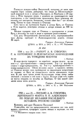 Рапорт А.В. Суворова Г.А. Потемкину о результатах наблюдения за турецким флотом. г. Кинбурн. 1788 г. мая 24 // ЦГВИА, ф. ВУА, д. 2415, ч. II, л. 200. Подлинник. Опубл. в сборнике военно-исторических материалов, вып. IV, «Письма и бумаги А.В. Суворова, Г.А. Потемкина и П.А. Румянцева. 1787-1789 г.» (Кинбурн-Очаковская операция). Д.Ф. Масловский, СПБ. 1893. стр. 1-179.