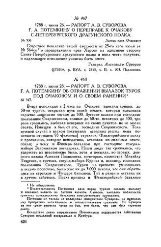Рапорт А.В. Суворова Г.А. Потемкину о переправе к Очакову С.-Петербургского драгунского полка. Лагерь пред Очаковом. 1788 г. июля 26 // ЦГВИА, ф. ВУА, д. 2415, ч. II, л. 303. Подлинник. Опубл. в сборнике военно-исторических материалов, вып. IV, «Письма и бумаги А.В. Суворова, Г.А. Потемкина и П.А. Румянцева. 1787-1789 г.» (Кинбурн-Очаковская операция). Д.Ф. Масловский, СПБ. 1893. стр. 1-179.