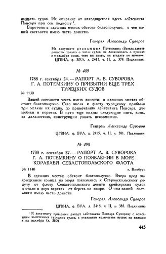 Рапорт А.В. Суворова Г.А. Потемкину о появлении в море кораблей Севастопольского флота. Г. Кинбурн. 1788 г. сентября 27 // ЦГВИА, ф. ВУА, д. 2415, ч. II, л. 385. Подлинник. Опубл. в сборнике военно-исторических материалов, вып. IV, «Письма и бумаги А.В. Суворова, Г.А. Потемкина и П.А. Румянцева. 1787-1789 г.» (Кинбурн-Очаковская операция). Д.Ф. Масловский, СПБ. 1893. стр. 1-179.