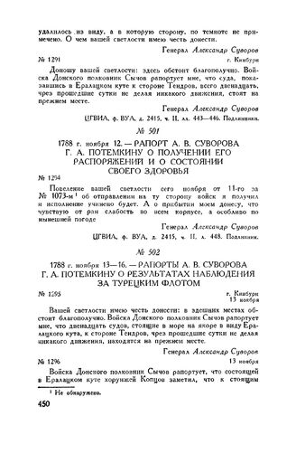 Рапорт А.В. Суворова Г.А. Потемкину о получении его распоряжений и о состоянии своего здоровья. 1788 г. ноября 12 // ЦГВИА, ф. ВУА, д. 2415, ч. II, л. 448. Подлинник. Опубл. в сборнике военно-исторических материалов, вып. IV, «Письма и бумаги А.В. Суворова, Г.А. Потемкина и П.А. Румянцева. 1787-1789 г.» (Кинбурн-Очаковская операция). Д.Ф. Масловский, СПБ. 1893. стр. 1-179.