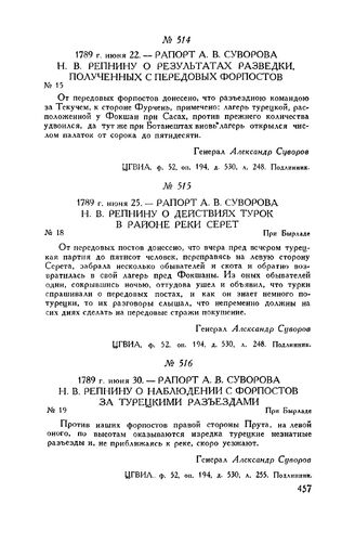 Рапорт А.В. Суворова Н.В. Репнину о результатах разведки, полученных с передовых форпостов. 1789 г. июня 22 // ЦГВИА, ф. 52, оп. 194, д. 530, л. 248. Подлинник. Опубл. в сборнике военно-исторических материалов, вып. IV, «Письма и бумаги А.В. Суворова, Г.А. Потемкина и П.А. Румянцева. 1787-1789 г.» (Кинбурн-Очаковская операция). Д.Ф. Масловский, СПБ. 1893. стр. 1-179.