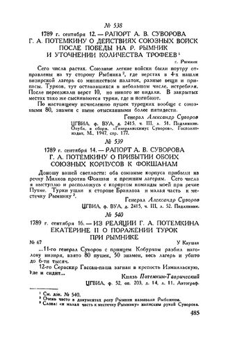Рапорт А.В. Суворова Г.А. Потемкину о действиях союзных войск после победы на р. Рымник и уточнении, количества трофеев. г. Рымник. 1789 г. сентября 12