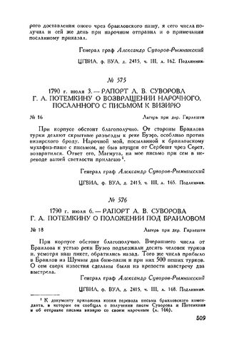 Рапорт А.В. Суворова Г.А. Потемкину о возвращении нарочного, посланного с письмом к визирю. Лагерь при дер. Гирлешти. 1790 г. июля 3 // ЦГВИА, ф. ВУА, д. 2415, ч. III, л. 165. Подлинник.