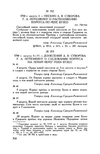 Донесения А.В. Суворова Г.А. Потемкину о следовании корпуса на левый берег реки Бузео. 1790 г. августа 4-11 // ЦГВИА, ф. ВУА, д. 2415, ч. III, лл. 206, 209-212, 214. Подлинники.