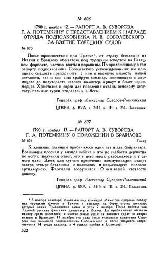 Рапорт А.В. Суворова Г.А. Потемкину с представлением к награде отряда подполковника И.В. Соболевского за взятие турецких судов. 1790 г. ноября 12 // ЦГВИА, ф. ВУА, д. 2415, ч. III, л. 255. Подлинник.