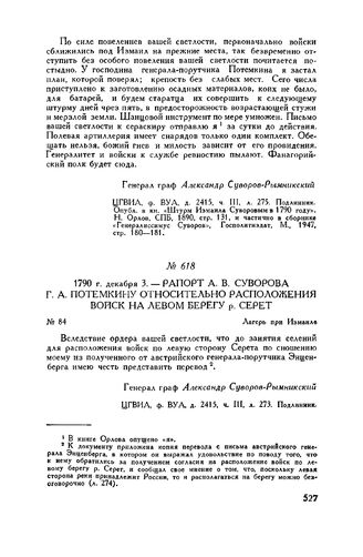 Рапорт А.В. Суворова Г.А. Потемкину относительно расположения войск на левом берегу р. Серет. Лагерь при Измаиле. 1790 г. декабря 3 // ЦГВИА, ф. ВУА, д. 2415, ч. III, л. 273. Подлинник.