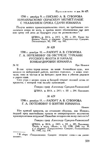 Рапорт А.В. Суворова Г.А. Потемкину о взятии Измаила. Измаил. 1790 г. декабря 11 // ЦГВИА, ф. ВУА, д. 2415, ч. III, л. 285. Подлинник. Опубл. в журн. «Маяк», ч. VI, СПБ, 1840, стр. 39, и в сборнике «Генералиссимус Суворов», Госполитиздат, М., 1947, стр. 191.