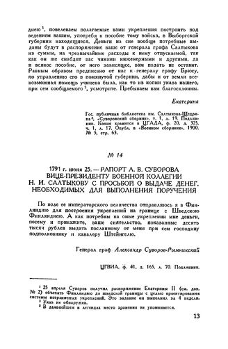 Рапорт А.В. Суворова Вице-президенту Военной коллегии Н.И. Салтыкову с просьбой о выдаче денег, необходимых для выполнения поручения. 1791 г. июня 25 // ЦГВИА, ф. 41, д. 165, л. 70. Подлинник.
