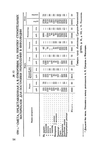 Смета, представленная А.В. Суворовым, на покупку строительных материалов для постройки укреплений в Финляндии. 1791 г.