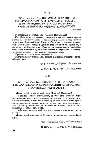 Письмо А.В. Суворова генерал-майору А.В. Тучкову с просьбой прикомандировать к пограничным укреплениям по одному кондуктору. Кюменегорд. 1791 г. октября 17 // ЦГВИА, ф. 41, д. 165, л. 92. Подлинник.
