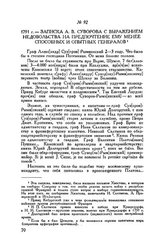 Записка А.В. Суворова с выражением недовольства на предпочтение ему менее способных и опытных генералов. 1791 г. // ЦГВИА, ф. ВУА, д. 275, лл. 6-7. Копия без подписи. Опубл. в кн. «Записки Одесского общества истории и древностей», т. 8, Одесса, 1872, стр. 284.