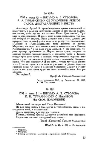 Письмо А.В. Суворова А.Л. Симанскому об ускорении рейсов судов, доставляющих известь. 1792 г. июня 13 // Отдел рукописей ГБЛ, ф. Симанских, М. 6818, л. 144. Подлинник.