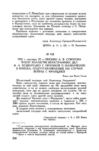 Письмо А.В. Суворова члену коллегии иностранных дел А.А. Безбородко с просьбой о назначении в войска, подготавливаемые на случай войны с Францией. Канал при Кроке Сильд. 1792 г. сентября 27