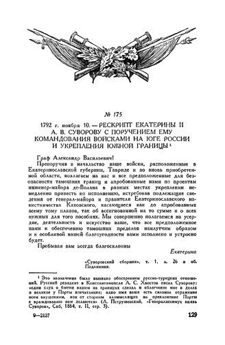 Главная Русские полководцы Русские полководцы. А.В. Суворов А.В. Суворов Т. III. 1791-1798 Документы Рескрипт Екатерины II А.В. Суворову с поручением ему командования в...