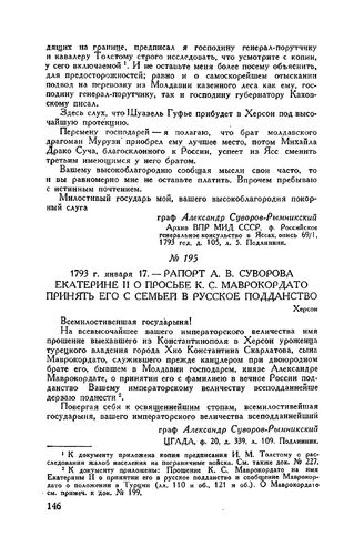 Рапорт А.В. Суворова Екатерине II о просьбе К.С. Маврокордато принять его с семьей в русское подданство. Херсон. 1793 г. января 17